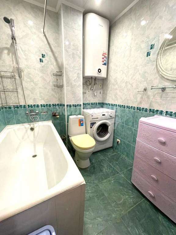 Ванная комната просторная, отделана кафелем. Установлена ванна, компакт-унитаз, бойлер 2022 г. в. на 100 л, пол с электрообогревом. Есть подводка для стиральной машинки.
